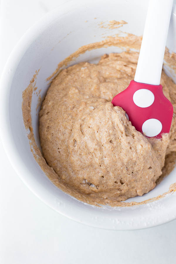 - Add wet to dry ingredients and mix until combined. The mixture will be lumpy – that’s OK! Add more almond milk to thin the mixture out if needed (I needed a couple Tbsp. worth).