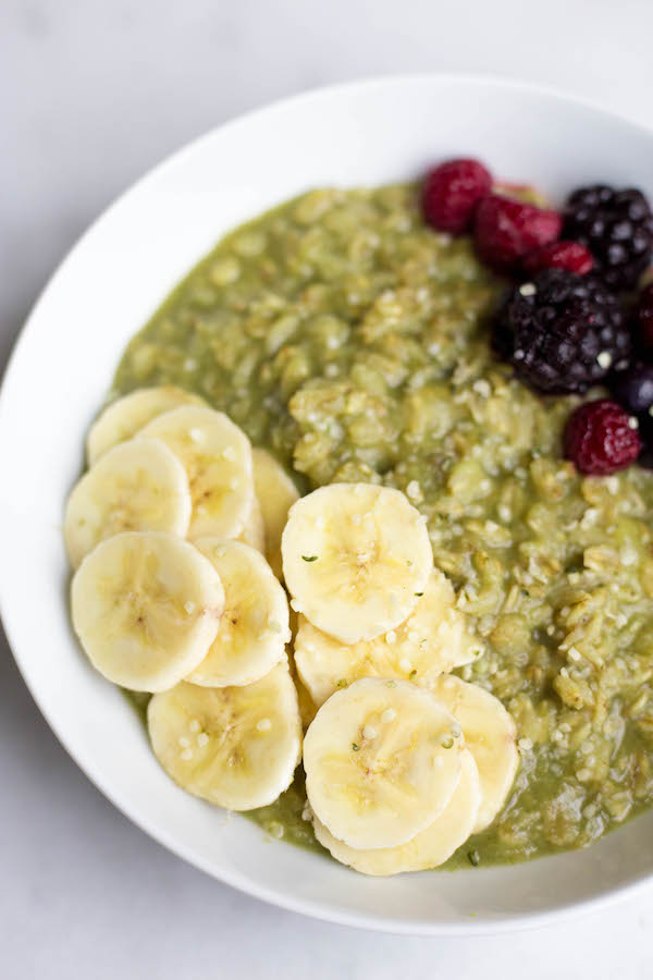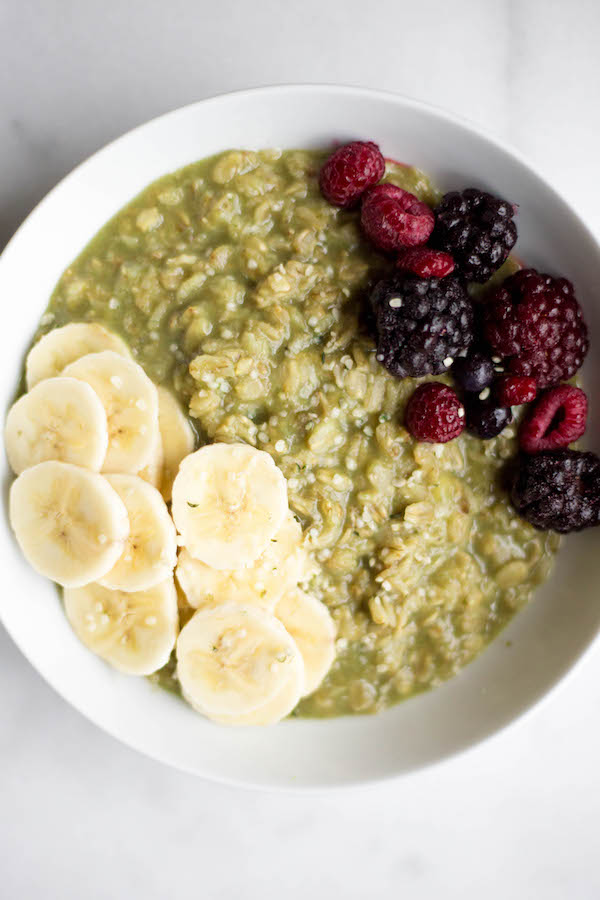 And now, the toppings. This oatmeal gets its sweetness from half of a mashed banana that’s cooked along with the green oatty goodness. I also ended up topping my bowl with the other half of the banana (sliced) for some additional sweetness. I also threw some beautiful frozen berries on top because I miss summer and I love them. And for some added protein, I sprinkled on some hemp hearts. But the toppings are totaaaaally up to you. If you’re a fan of nut butter, by all means throw some on! If you’re a fan of ch-ch-ch-chia seeds, dooooo itttt! The world is your oyster smoothie oat bowl!