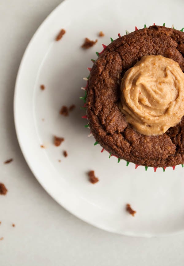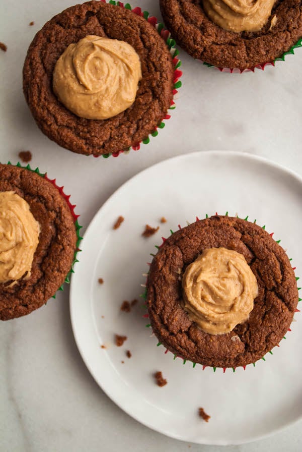 Because of all of this (sorry) moistness going on, the muffins will probably sink in the middle ever-so-slightly. No matter! Just fill the little crevice with a creamy peanut butter-almond milk-maple syrup mixture, and it’ll act as the BEST healthy “frosting!” It’s our birthday, dangit! Let’s celebrate with healthy peanut butter frosting mmmkay?!