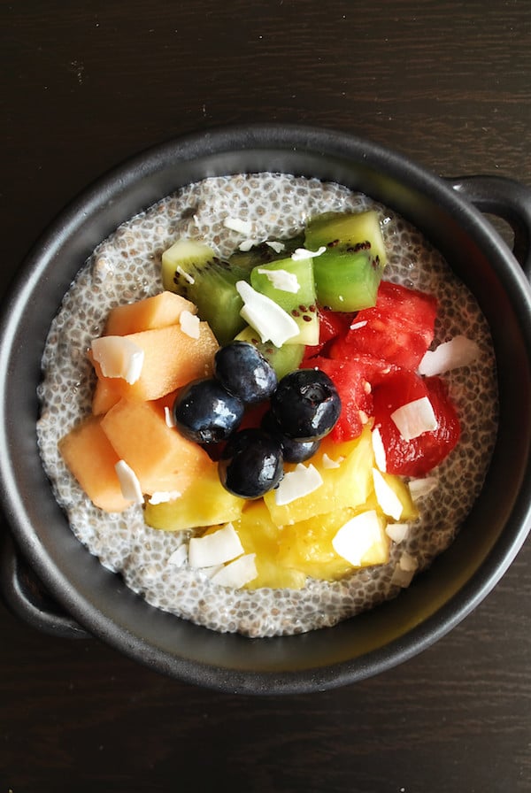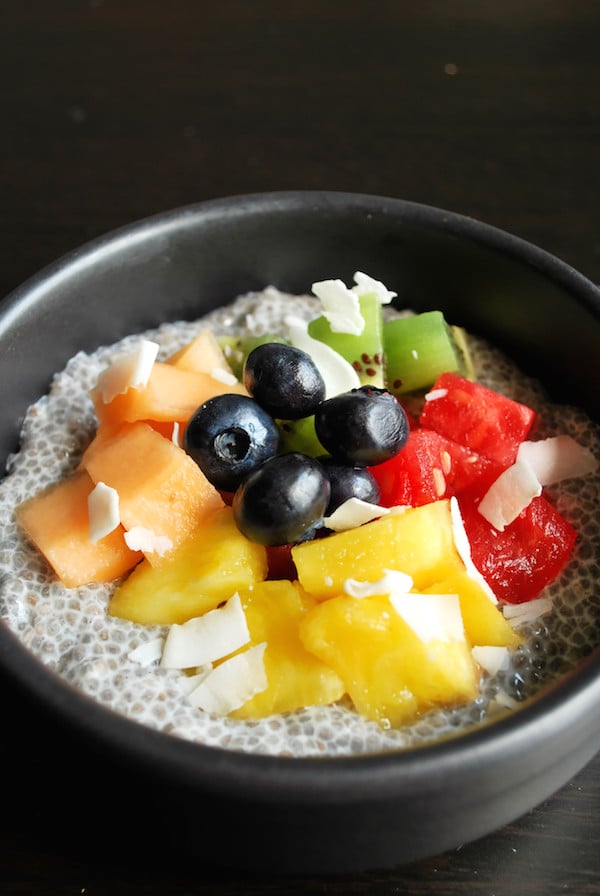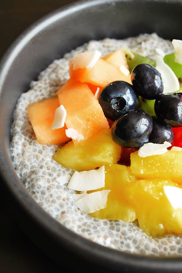 I am a self-confessed chia seed freak. Not only do they give an impressive amount of protein (6 grams) and fiber (10 grams) to this Fruit and Chia Bowl, they add such a unique and fun texture to it, too! Now, I’m fully aware that it takes a special kind of person to enjoy chia’s tapioca-esque texture. If you’re one who’s a little freaked over their beady texture, feel free to give the pudding a whirl in your blender; you’ll be left with a fluffy, pudding-like mixture with no seeds in sight!
