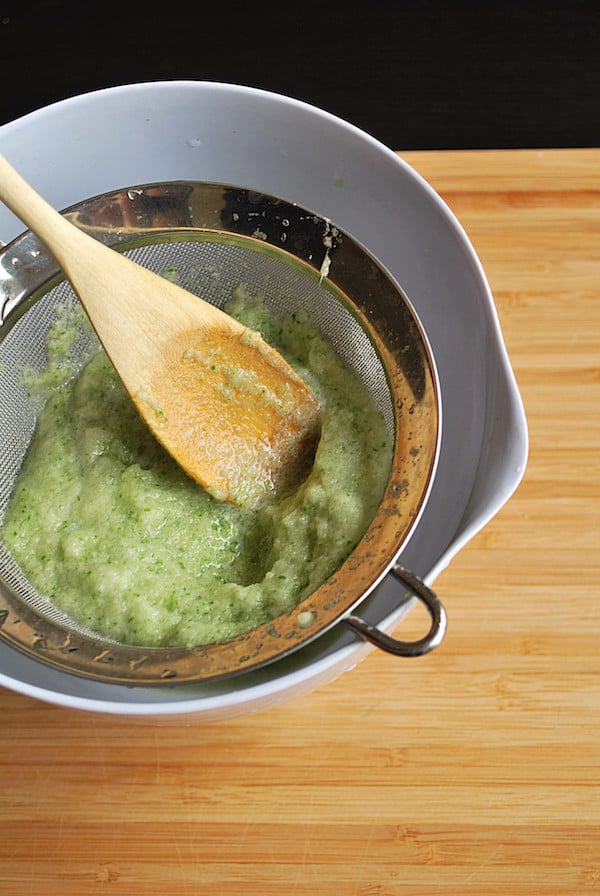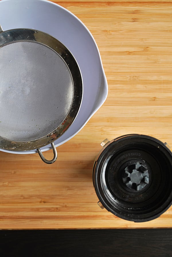 Step 3: Place a fine-mesh sieve/strainer over a bowl. If you have it, you can line this sieve with cheesecloth for even more straining power, but I didn’t bother this time around.