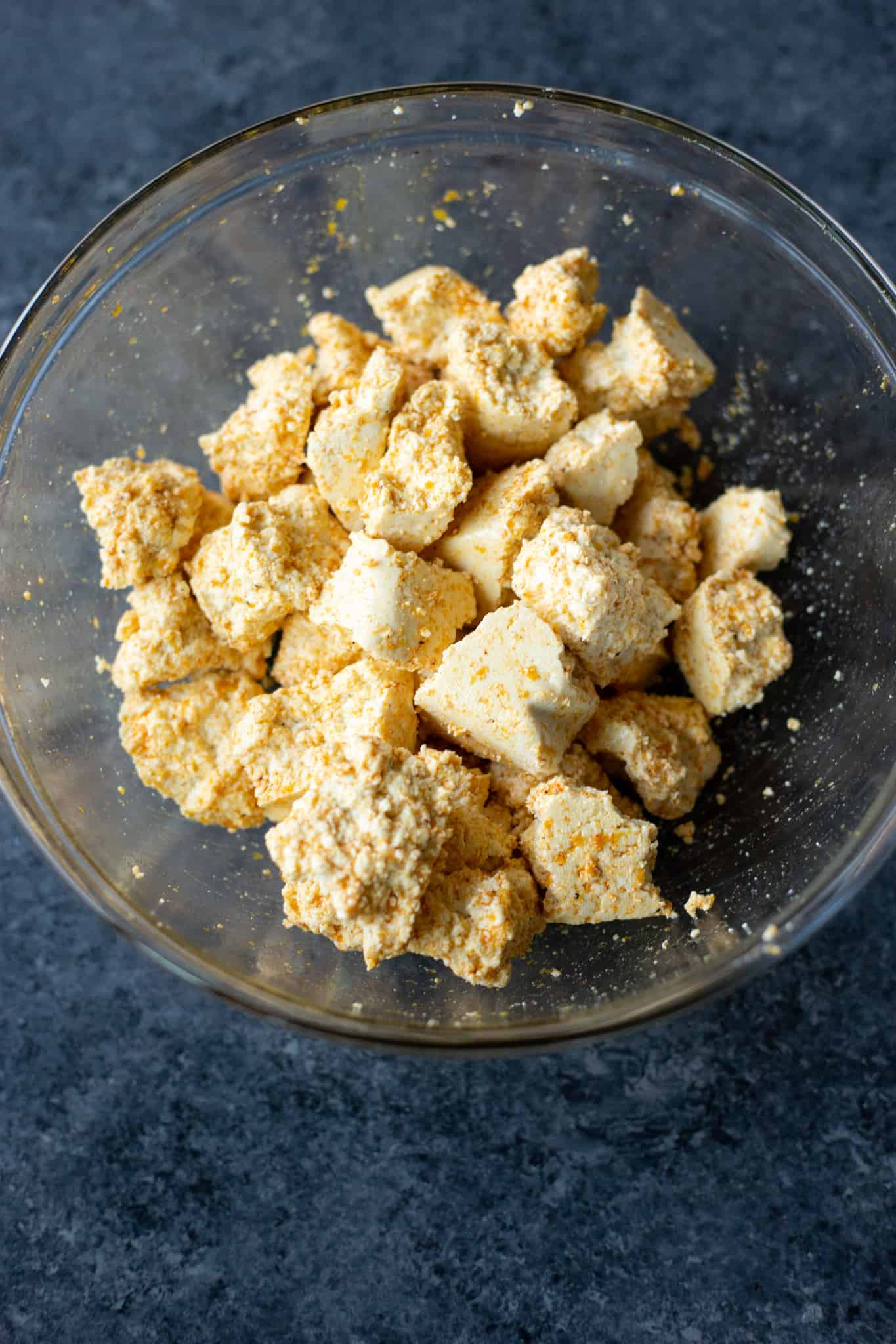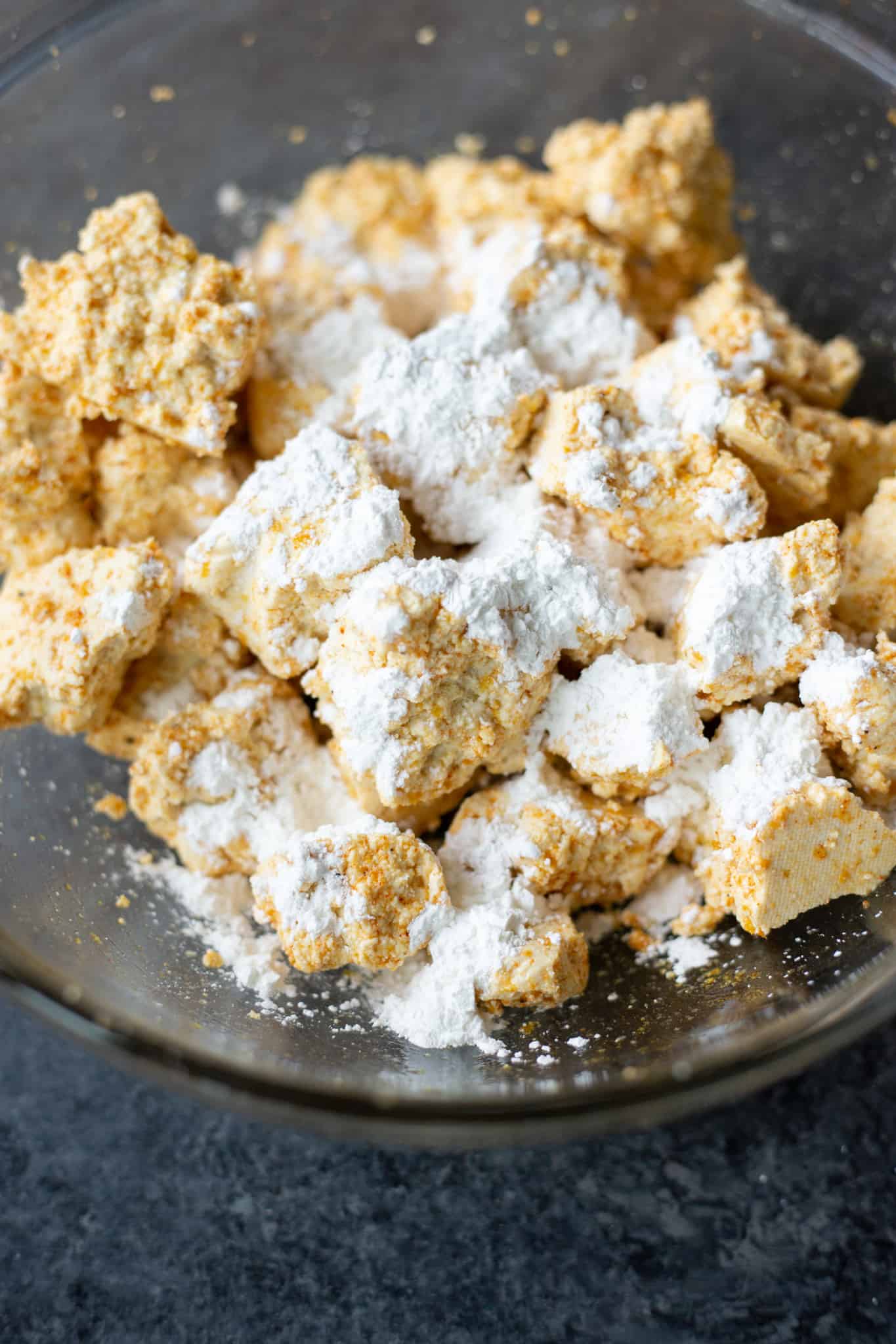 The uneven texture of torn tofu helps collect that marinade (aka. more flavor!) and creates peaks and valleys that get extra crispy and crunchy. Plus, we’re using cornstarch for even more of that crunch-factor.