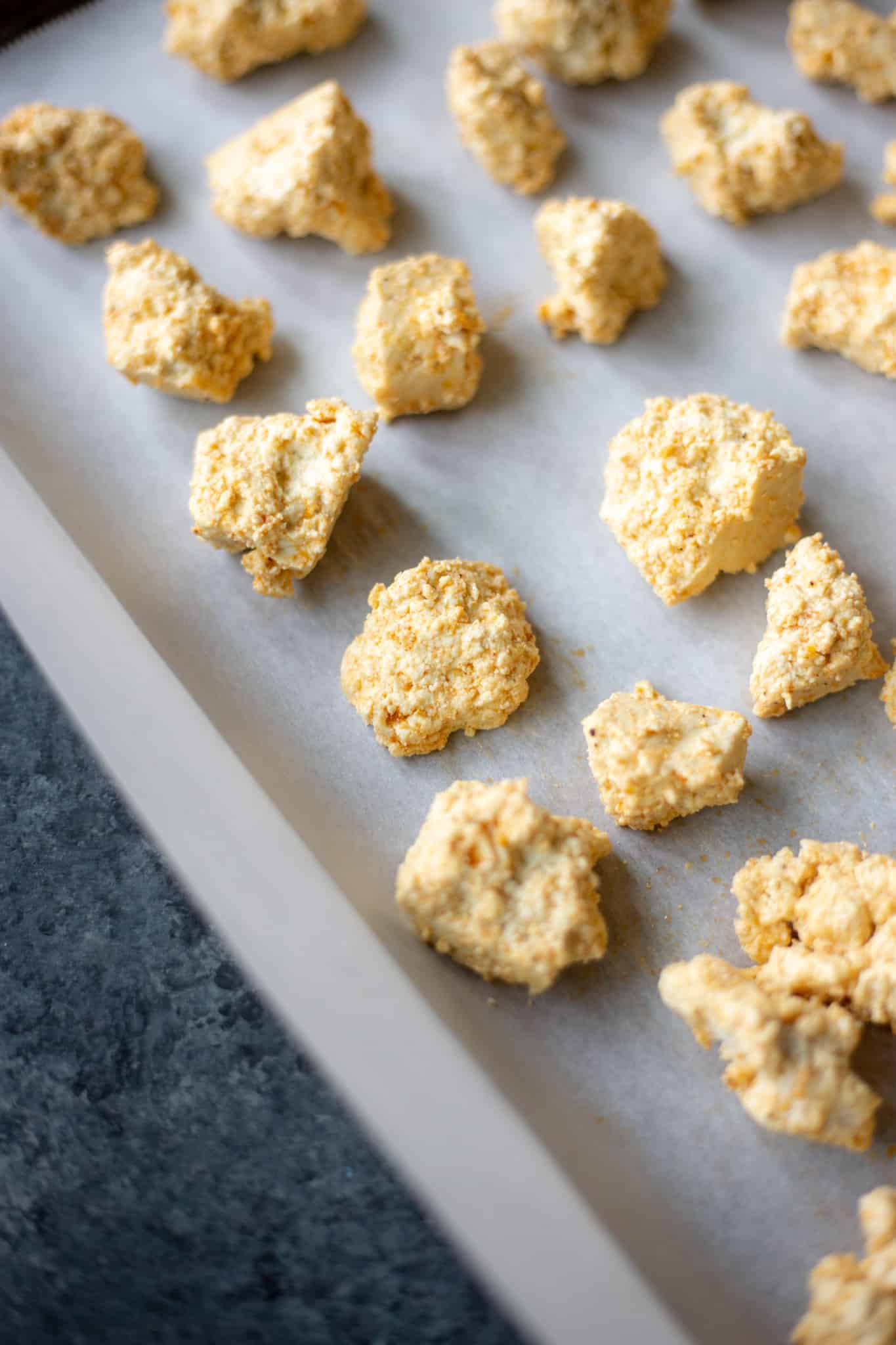 - Place each nugget on your prepared baking sheet so that it’s not touching the other tofu pieces. If you have a few small bits of broken tofu at the bottom of your bowl, add a bit more cornstarch and squeeze the bits together to form nugget-sized pieces. These guys get EXTRA crispy when baked!