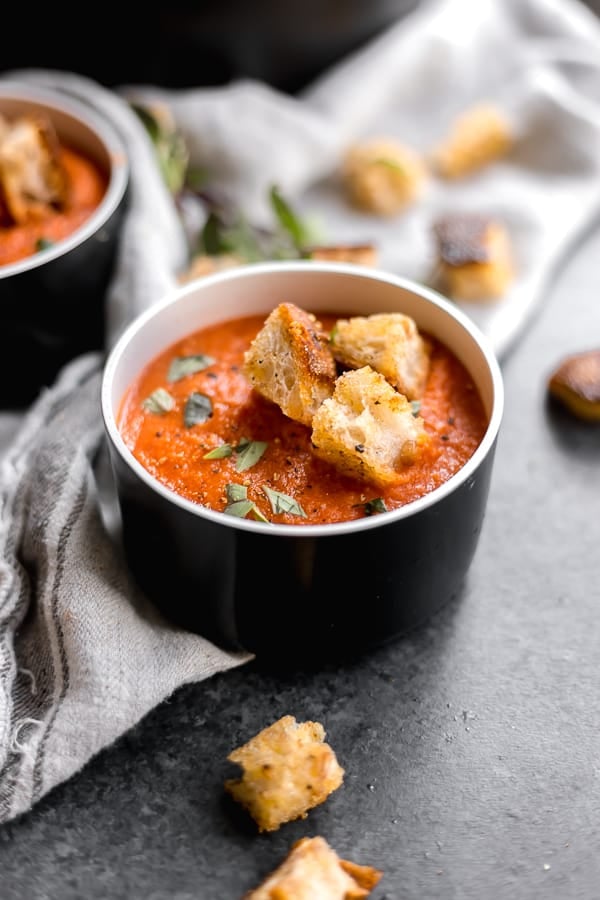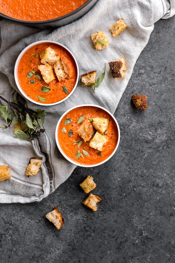 Velvety, creamy, cozy tomato soup, ready in 15 minutes for your dipping, slurping pleasure. Perfect with crusty homemade croutons and fresh basil on top!