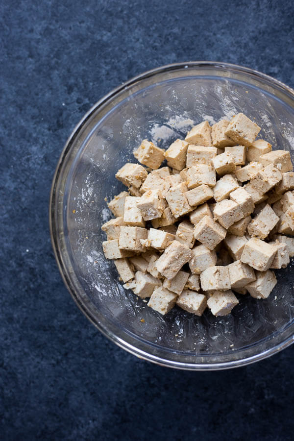 - Use arrowroot flour. The KEY to this crispy situation. If you don’t have arrowroot flour / starch, you can probably use cornstarch instead! But you toss the tofu in this flour / starch, and cook it on the stove with a wee bit of coconut oil. The arrowroot crisps up perfectly and gives our tofu cubes a nice little crust.