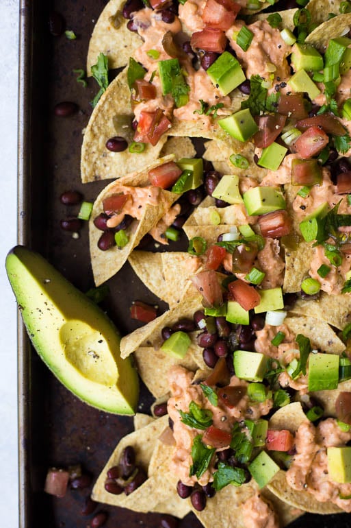 It’s so simple. You basically make a simplified half batch of my Buffalo Chickpea Dip, cut up some veggies and cilantro, toss it all on some tortilla chips, and mayyyyybe drizzle some homemade cashew sour cream on top. If you’re feeling zany.