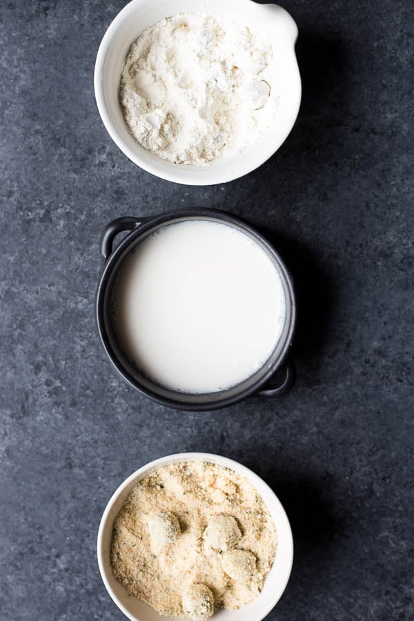 - OLIVES:Grab three medium bowls. Add breadcrumbs, oregano, garlic, salt, and pepper to one bowl. Mix to combine. In another bowl, add your flour. In another bowl, add almond milk and apple cider vinegar. Mix to combine.