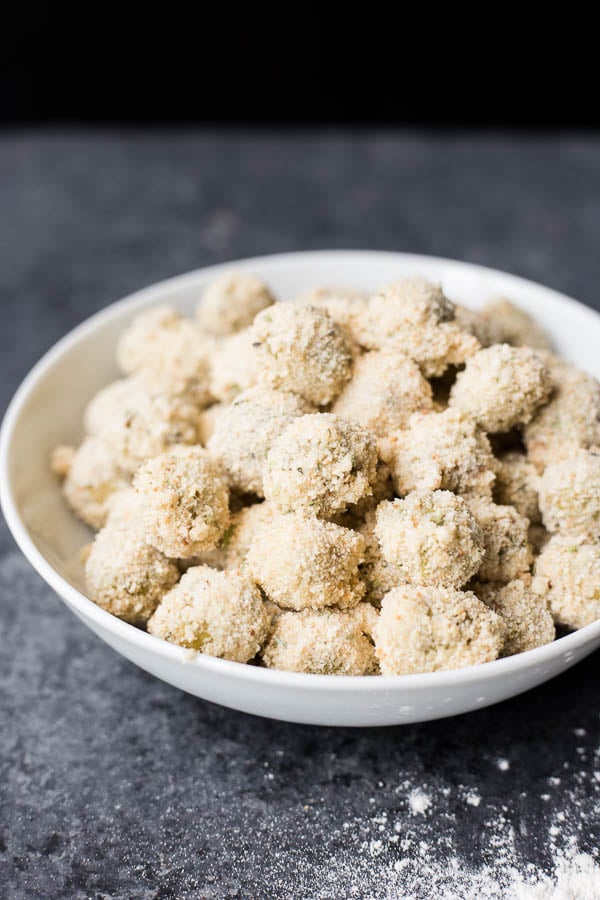 - The Dredge. Yep, we’re coating these olives in breadcrumbs – that’s what gives these olives their crunch! The olives stay super tender after they’re baked, but the outside coating is nice and crispy. In order for the breadcrumbs to stick to our delicious olives, we need to do the Dredge Dance – coat the olives in flour, then in homemade buttermilk, then in your seasoned breadcrumbs. Badaboom, so simple.