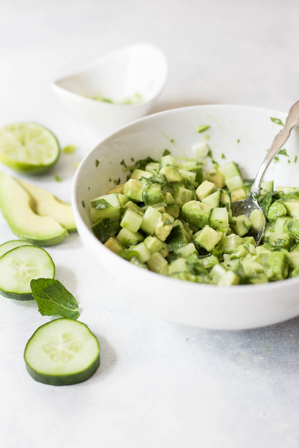 - Combine cucumber, avocado, green onion, lime juice, mint, and cilantro in a medium bowl. Mix to combine, taking care to not break up the avocado too much.