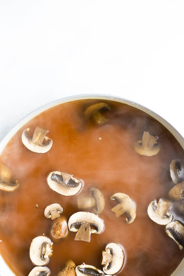 Starting with mushrooms! Woot woot. I love me some mushrooms. Like love love love. I like using baby bella mushrooms because they’re a bit meatier than those white button mushrooms. We’re going to simmer some vegetable broth with these baby bella mushrooms so that the broth becomes mushroomier, and therefore meatier.