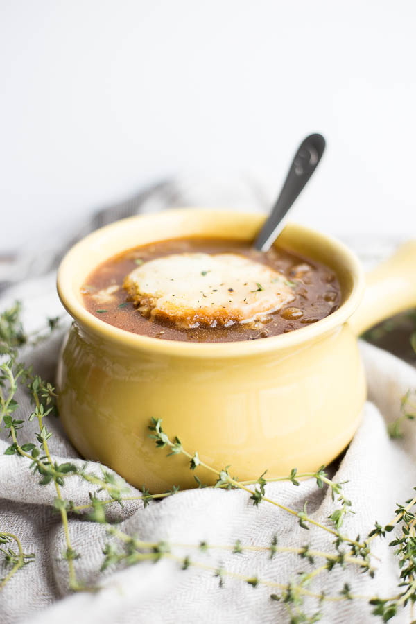 When I was a kid, there were three soups I went absolutely crazy for: Broccoli & Cheese, Chili, and French Onion. So when we were out to dinner a few years ago and they had french onion soup on the menu, I was super duper excited because I hadn’t had it in FOR-EV-ER. However, something told me to check the ingredients just to make sure it was veg-friendly.