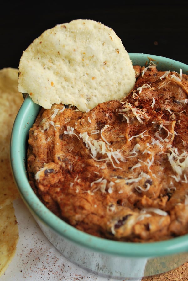 Next, the “smoky” part of the equation. Chipotles in adobo and chili powder give this dip a nice heat that’s not too overwhelming. Rather than adding a bright, smack ya in the mouth heat to this mix like buffalo sauce would, the heat here is deep and rich and warms you from the inside-out. Add some parmesan cheese to the mix for some salty goodness, and it adds just the right flavors to make you come back for more and more. Addictive, I tell ya. Totally addictive.