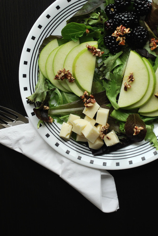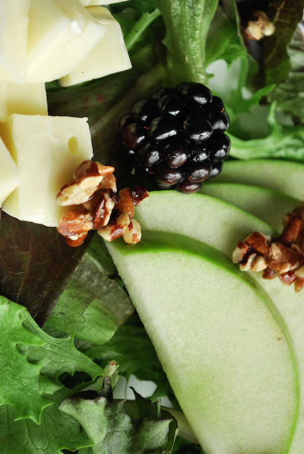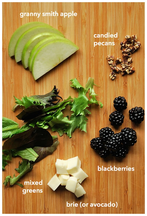 - Assemble the salad: Dress mixed greens in just enough dressing to lightly coat greens.* Place apple, blackberries, and brie on top. Crumble candied pecans on top.