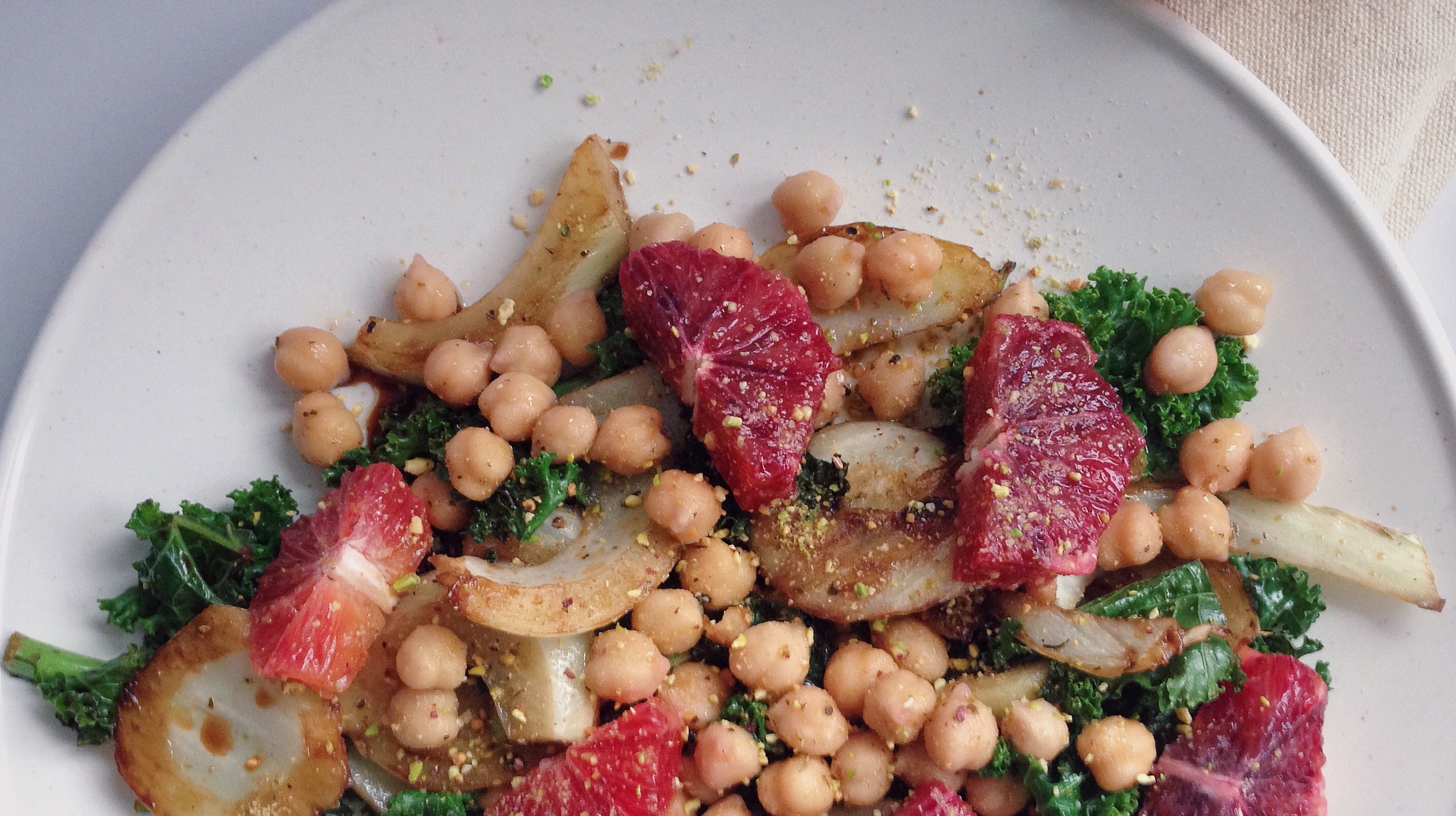 - Plate it up: Add the kale and fennel to a plate. Using a fork or slotted spoon, spoon chickpeas out of their marinating liquid*. Top with the blood orange slices and pistachio dust**. Season with salt + pepper if necessary.