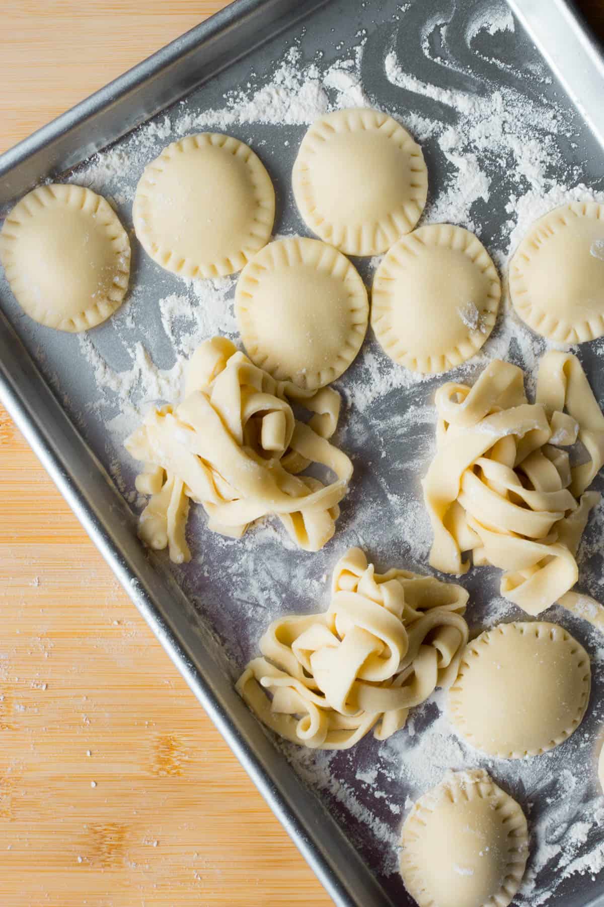 - Place the ravioli on a flour-dusted cookie sheet, and place in the freezer. I like to cook mine from frozen, but even if you’re cooking them soon, put them in the freezer until it’s boiling time!