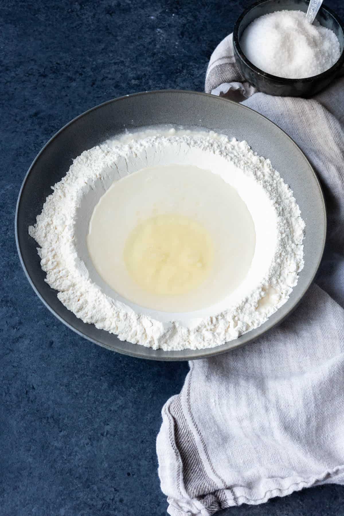 - Add your flour to a large bowl. Make a well and add your water, olive oil, and salt.