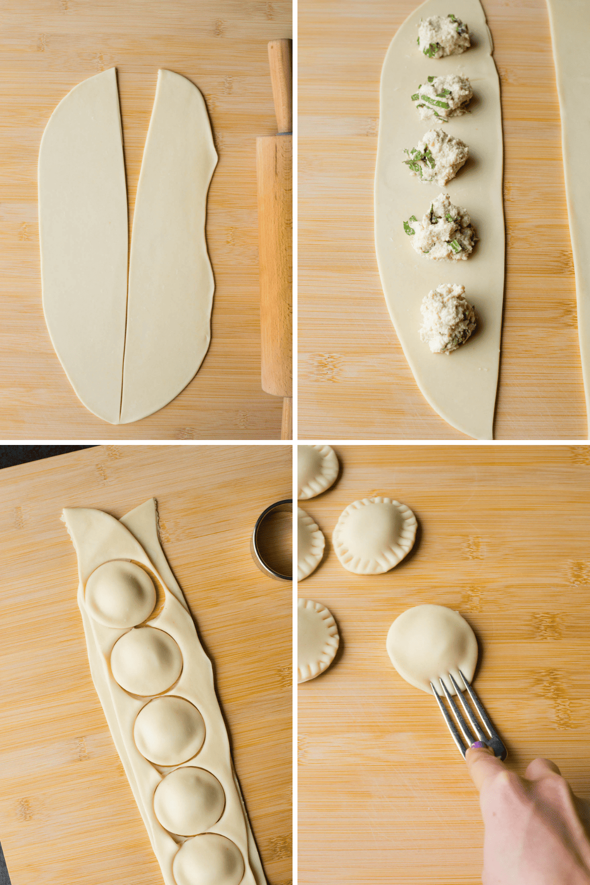- Using a circle cookie/biscuit cutter (or your cutter of choice) that’s bigger than your ricotta mound to allow for proper sealing, punch out your ravioli, and then crimp the edges using a fork.