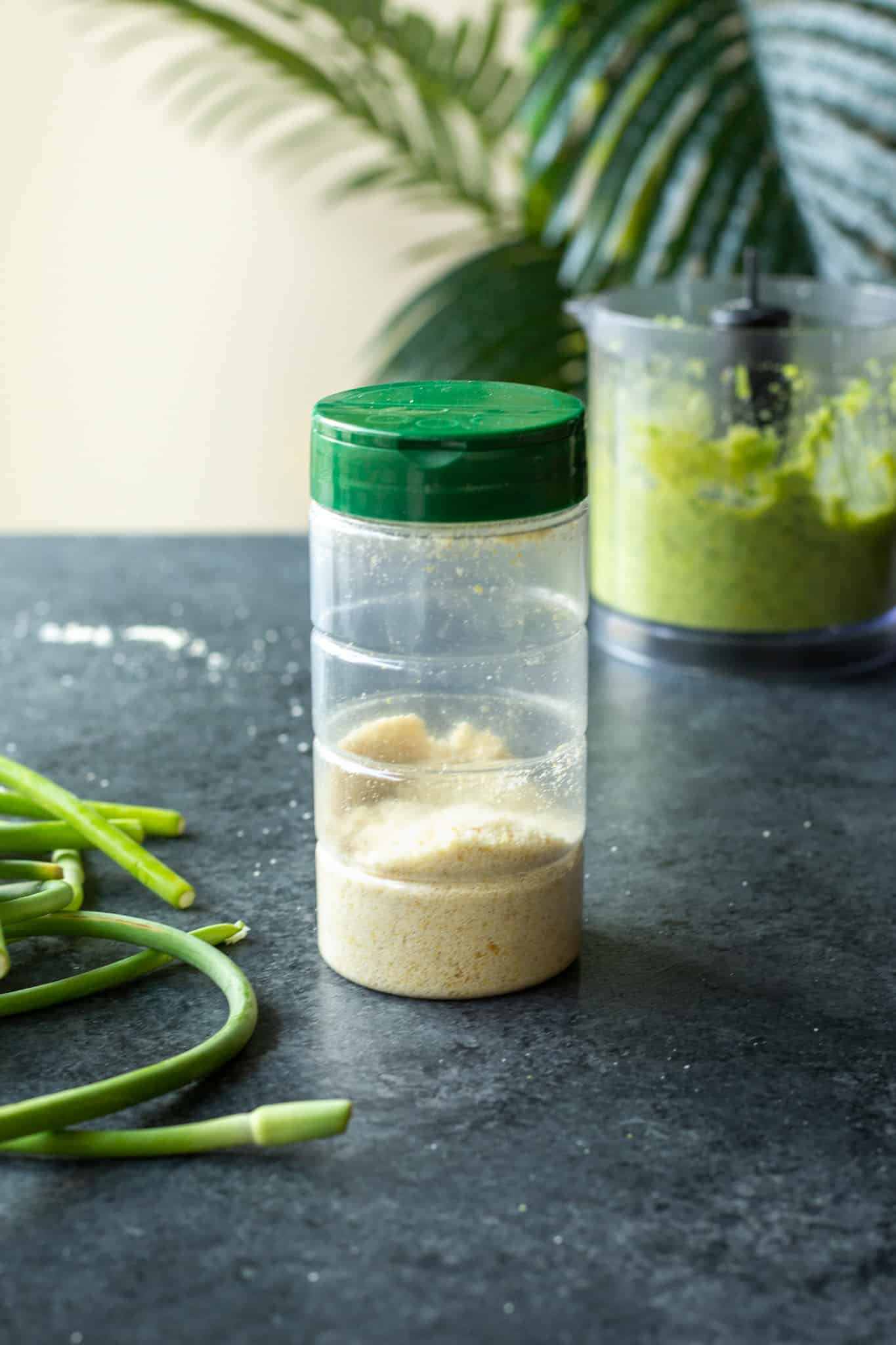 - For the Vegan Parmesan: Add almond flour, nutritional yeast, and salt to a bowl. Whisk well to combine and remove lumps. Store in an air-tight container.