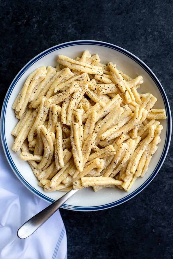 This post is sponsored by my Pittsburgh-based friends, DeLallo! We’re using their beautiful new Casarecce Pasta in this Vegan Cacio e Pepe recipe.