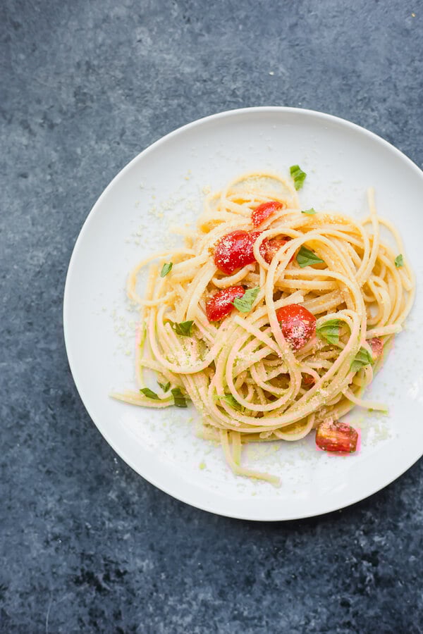 First: omg. This is my ideal pasta situation. Tons of garlic, fresh tomatoes (from the Fooduzzi garden!!), lots of torn basil, rich extra virgin olive oil…and that’s about it.