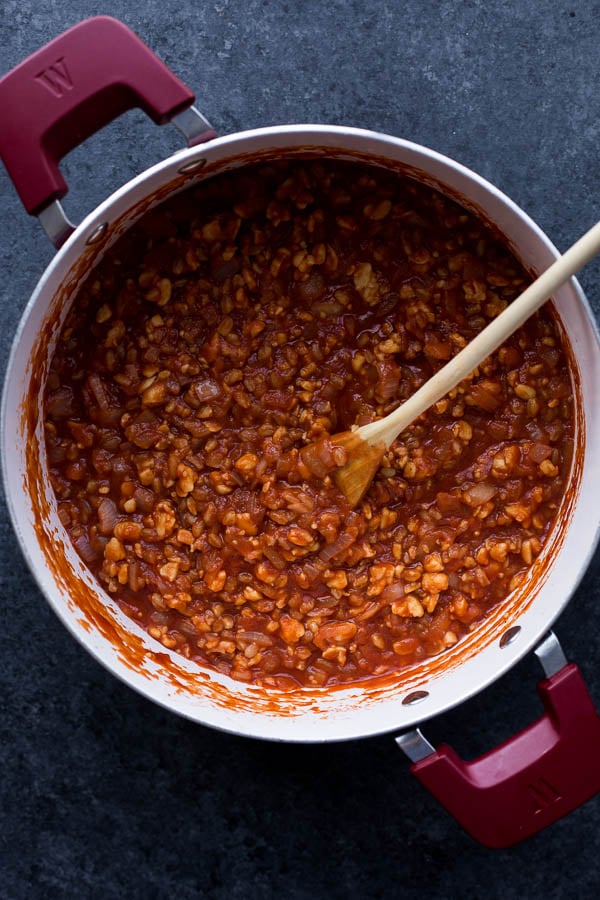 This sloppy mixture comes together all in one pot, and it starts with an onion! Minced and sautéed until translucent. You’ll also add in your tempeh and cooked farro in this step too.