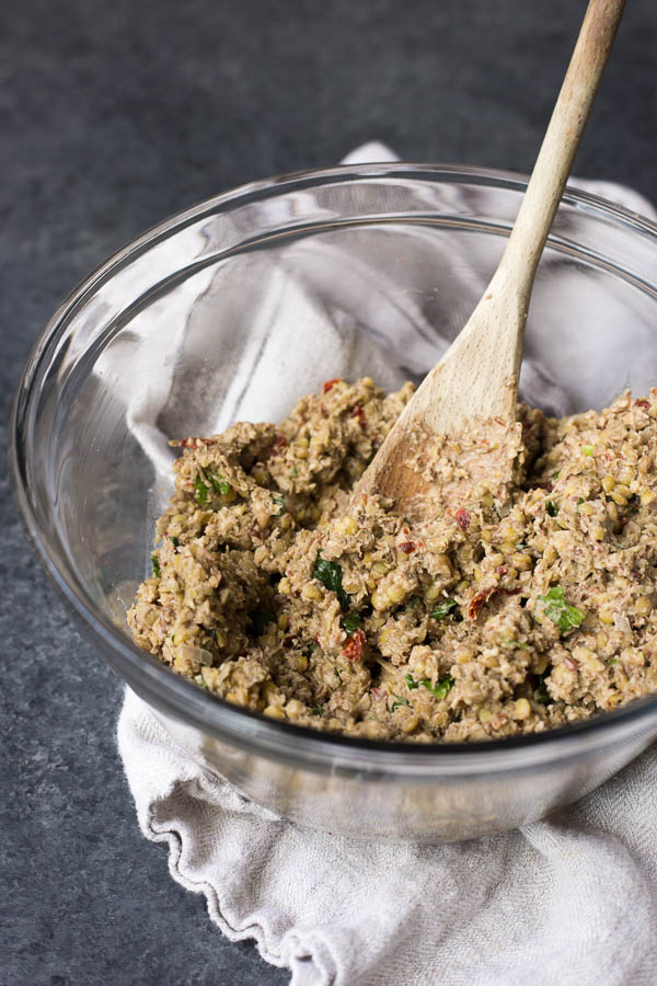 As for the flava: sun dried tomatoes, parsley, garlic, shallot, and oregano. So like, a lot. There’s a lot happening here, but it works together perfectly! Sun dried tomatoes are super sweet – I swear they’re like candy -, so a little goes a long way. And this is a great time of year to use up the rest of your summer herbs, so fresh parsley is a MUST.