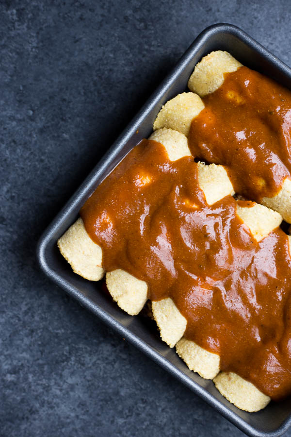 HELLO. Who knew making homemade enchilada sauce was so easy?! I used this recipe, and I highly recommend you do the same. I did end up adding a dash of smoked paprika and a tiny pinch of cayenne, but it was fantastic all on its own. And you can make it a few hours in advance, which is what I did! But if you’re not interested in making the sauce from scratch, you can totally use store-bought!