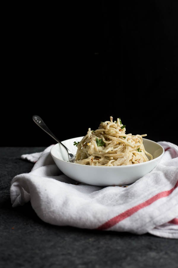 SO. I have a love / eh it’s okay relationship with cauliflower. Right now, I’m in that holy moly I love this veg so much phase, and I can’t get enough. Seriously, this is only the first of a few cauliflower-centric recipes you’ll be seeing on the blog. But woah. I just love blending it into creamy deliciousness. We’ve done mashed cauliflower, we’ve done cheesy cauliflower dip. But cauliflower alfredo might be my fave application yet.