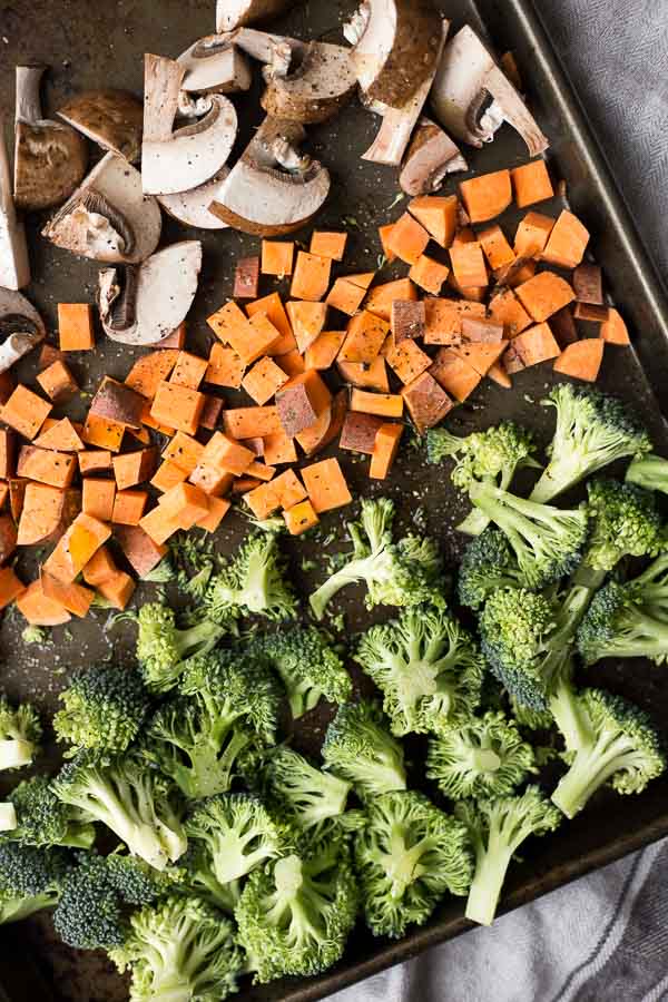 - Roasted veggies. You all know I love me some roasted veggie goodness. So that’s what we’re doing here. Broccoli, mushrooms, sweet potatoes – into the oven until nice and caramelized. Feel free to change up the veg to your liking.