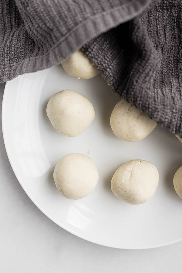 Step 3: Form 9-10 smooth dough balls. Once formed, put your dough balls on a plate covered by a damp (but not sopping wet) cloth. Set aside.