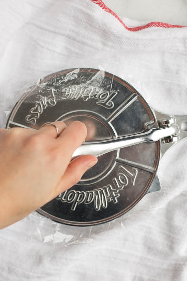 - Place a piece of saran wrap between the two flat parts of your tortilla press. The tortillas will stick to your press if you skip this step. And that would make for a very sad taco.