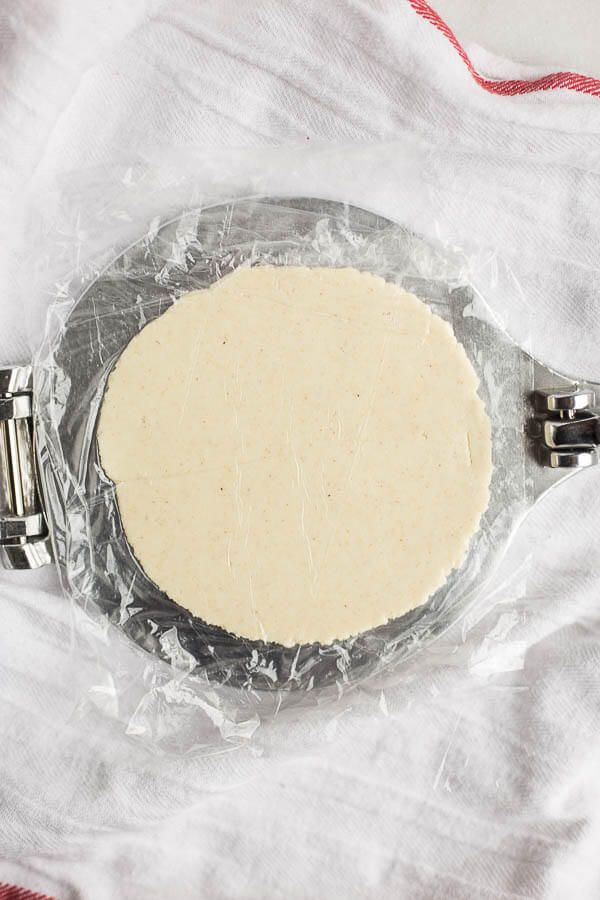 Step 4: Prepare your handy dandy tortilla press. You’ll want to place a piece of saran wrap between the two flat parts. The tortillas will stick to your press if you skip this step. And that would make for a very sad taco.