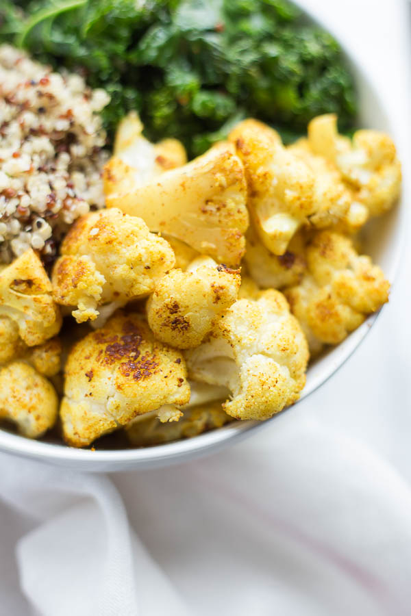 We’ll also roast some cauliflower. The bright yellow color its sporting is directly attributed to curry powder. I pick mine up at Trader Joe’s (hello, $1.99 spices), and it’s delicious. Curry powder is actually a mix of a few different spices including turmeric, cumin, cloves, and cinnamon, giving anything it touches a wonderful sweet-and-savory flavor. And that color? You just can’t beat it!