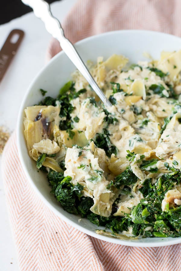 And girl. Using hummus to make the pasta creamy – like, why you so smart? Seriously, such a good idea. Anything spinach and artichoke is a winner in my book!