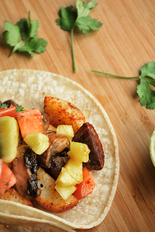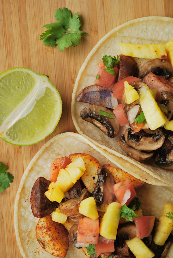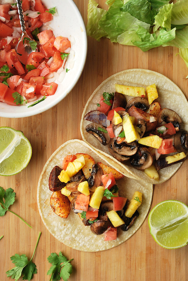 - Assemble The Best Damn Vegetarian Tacos of your life: Heat tortillas in the microwave (about 25 seconds wrapped in a damp paper towel will do!). Add potatoes and mushrooms to the tortilla. Top with Pico de Gallo, pineapple, and a squeeze of lime. Top with romaine, guacamole, Cholula, and cheese.