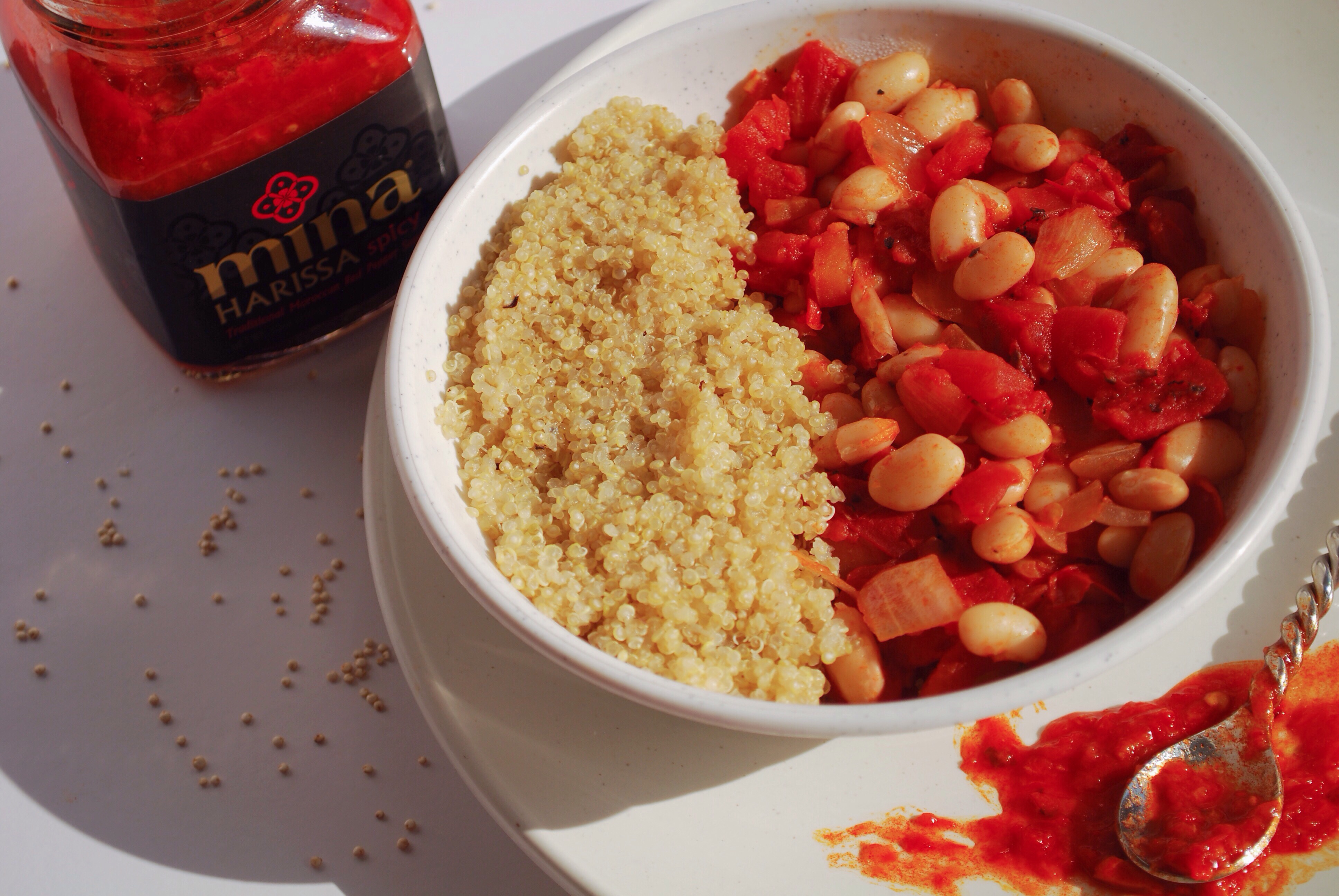 Harissa beautifully marries with roasted tomatoes to form an exciting and flavorful base for creamy white beans and protein-packed quinoa. Whole food simplicity at its [spicy] finest.