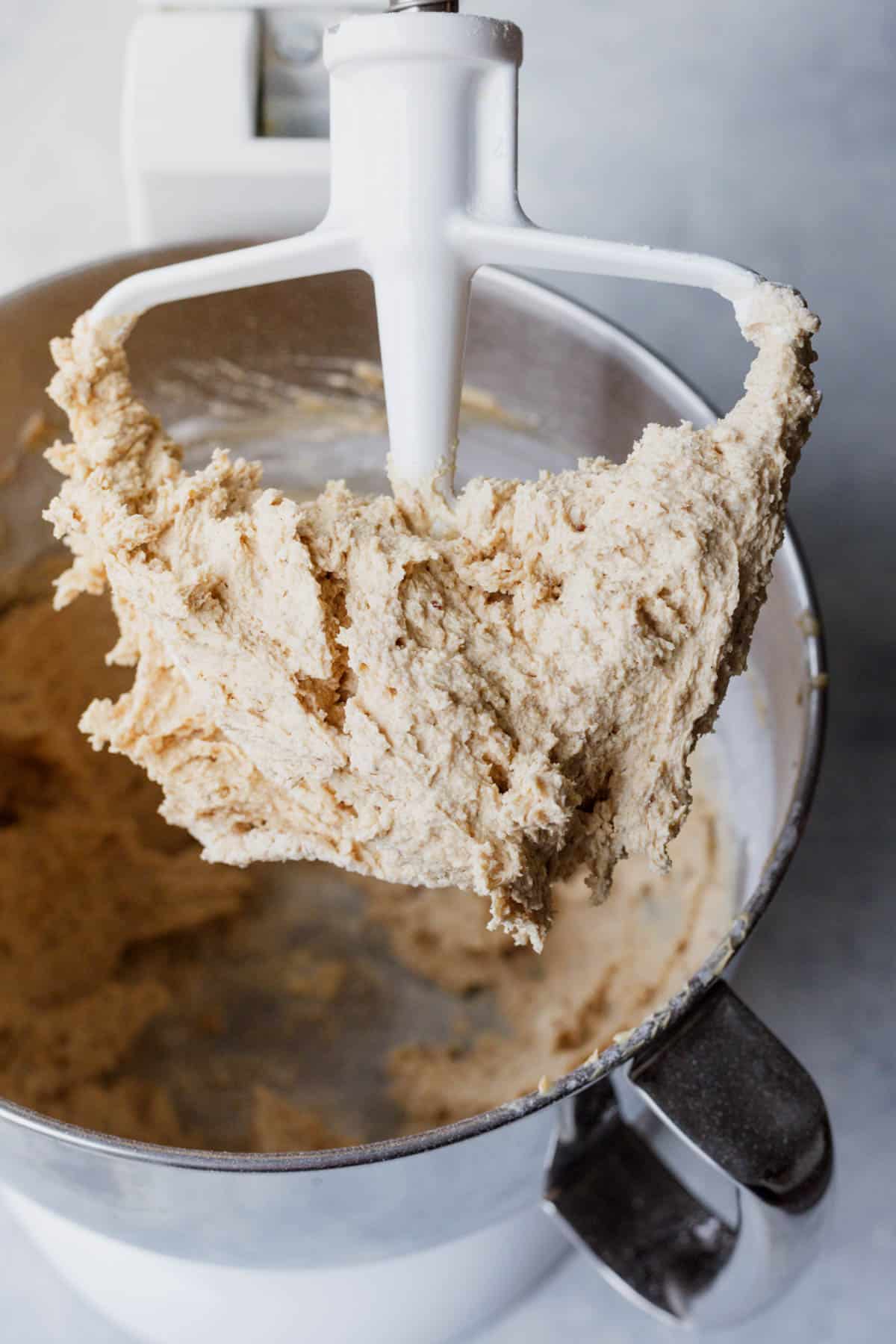 - Add vegan butter and peanut butter to a stand mixer fitted with a paddle attachment (or use a big bowl and a hand mixer!), and beat to combine for 1 minute. The mixture should get nice and fluffy. Scrape down the sides.
