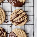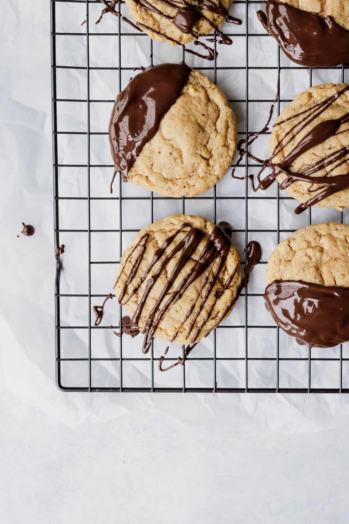 But for all of those recipe failures, I couldn’t be more tickled with what we ended up with: super soft and chewy peanut butter cookies with crispy edges, drizzled or dunked in chocolate.