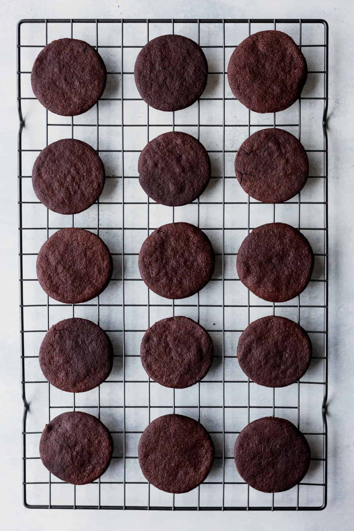 - Roll your dough into 1/8-inch slab, and cut out your cookies with a circle cutter that’s 2 and 1/2-inches wide. Dust any excess cocoa powder off the tops of your cookies, and transfer them to your baking sheet.