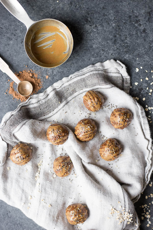 And for the energy: seeds! I love adding seeds to my diet because they’re full of protein, healthy fats, and fiber, and I always have them in the house. Today we’re using ground flax to bind our bites together, and Bob’s Red Mill Organic Chia Seeds for some texture and crunch! Whenever I need seeds, I always reach for BRM. Always always always. The quality, flavor, and all-around awesomeness – ya can’t beat it.