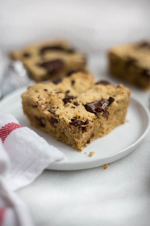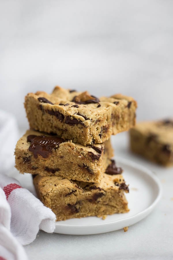 Speaking of which: It’s my favorite cookie base! It’s pretty much the same base that we use for these Best Damn Vegan & Gluten Free Chocolate Chunk Cookies. Seriously. Best damn. And so many of you who have made them agree! But if you thought the cookies were good…just WAIT until you bake them off into blondies. They only take about five more minutes to bake, but you don’t need to chill them so yay! And the result is pretty stunning, especially if you stack them one on top of another like a food blogger: