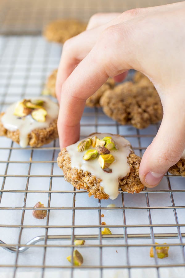- To assemble***: Spoon icing over cooled cookies. Sprinkle with chopped pistachios.