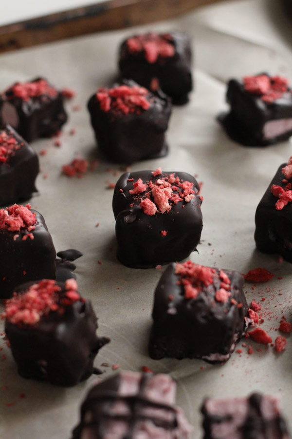 - Using a fork, dunk each heart into the chocolate mixture, flip to cover the other side, tap to remove any excess chocolate, and then return to the baking sheet. Once all hearts have been dunked, return the hearts to the freezer to set.*