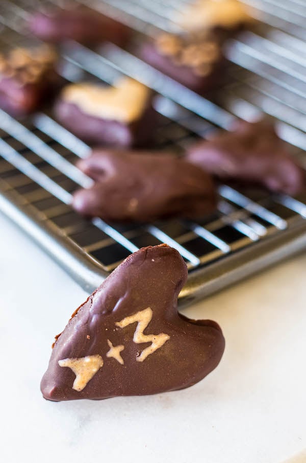 Our sweetener in the peanut butter filling and in the chocolate coating comes a la maple syrup. I use this minimally-processed sweetener in almost every dessert recipe I post on the blog because I love the warm, earthy flavor it gives just about everything! Here, it gives these PB hearts just enough sweetness, while still letting the addictive richness of the peanut butter really shine.