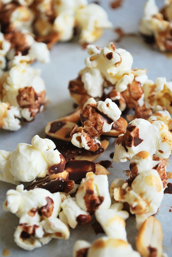 While this isn’t our typical “recipe” (aka. a mountain of smoked paprika and salt), I’m thinking that this Chocolate Peanut Butter Popcorn is bound to work itself into our daily ritual. It’s salty, sweet, and just the right about of “sinful.” It’s everything you want in an after-dinner treat, and it’s laughably simple to make. In other words: this Chocolate Peanut Butter Popcorn is the real-freakin’-deal.