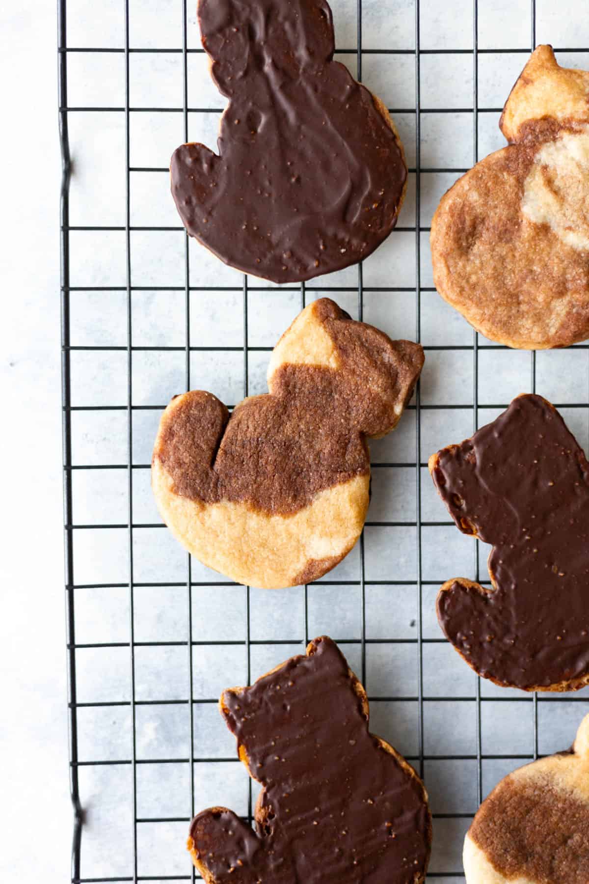 Since sugar cookies typically get some sort of icing/sugar coating for extra flavor and texture, I decided to spread melted chocolate on the backs of these cookies. I didn’t want to cover up the cute design, and the thin chocolate coating just gives the baked cookies a bit of a flavor boost.