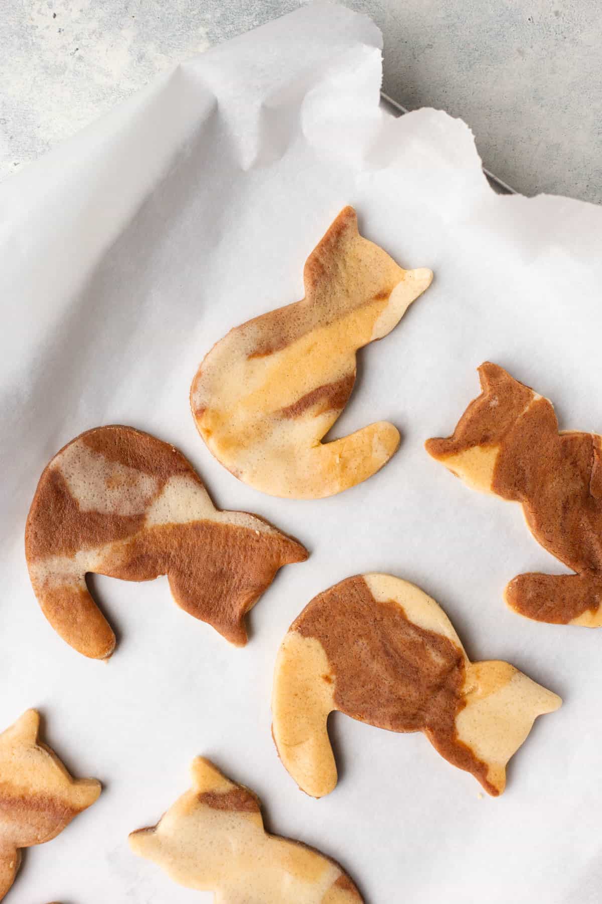 - The next day, cut out your cookies using your favorite cat cookie cutters. You can re-roll the dough to get more cookies out of your batch, but the look will be more tortoise-like than calico! Still v cute.
