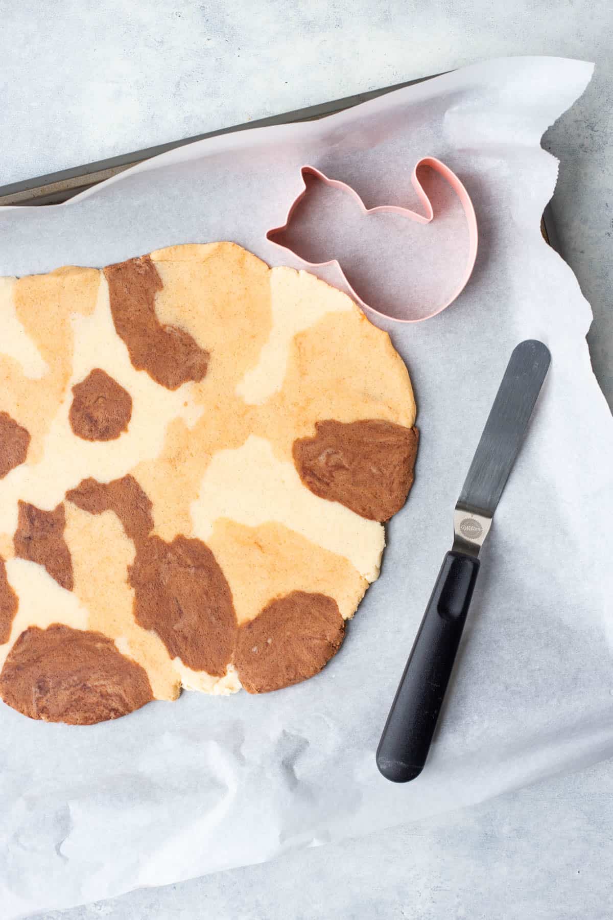 - Line a baking sheet with parchment paper. Take the three different colored doughs and form them into small, irregular patches (see photos). Gently press the patches together on the parchment paper to create a calico pattern.