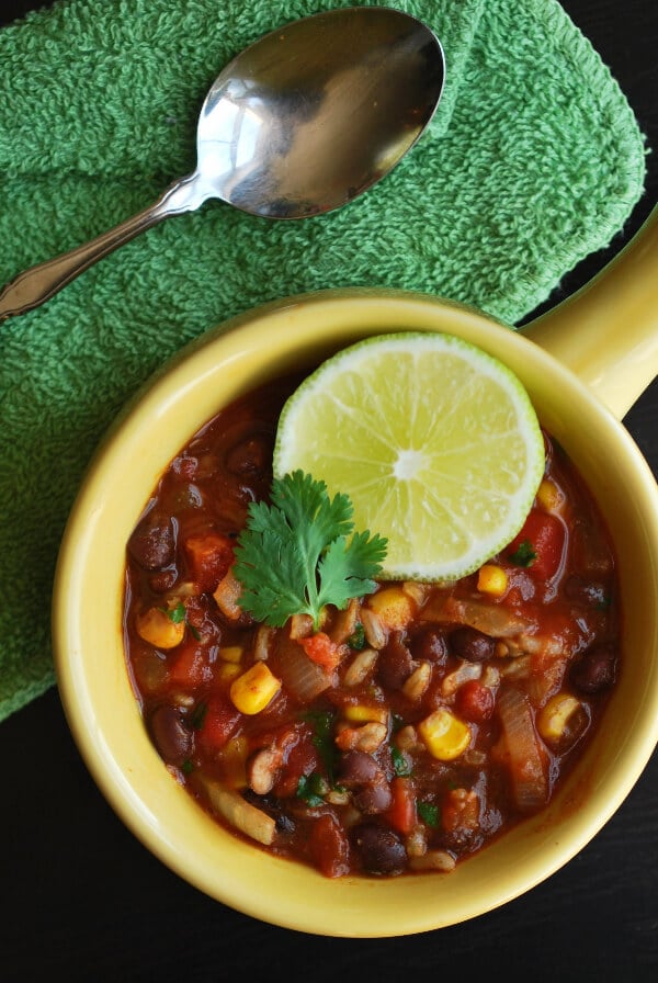 No matter how much we may want to fight it, winter is coming. When it’s cold, dreary, and all-around blah outside, nothing is more comforting that a big bowl of soup. This burrito bowl soup is full of bright Mexican flavors, and it’s loaded with veggies and beans to keep you feeling fuller longer. Don’t skip that sprinkle of lime juice at the end; it seriously elevates all of these awesome flavors!