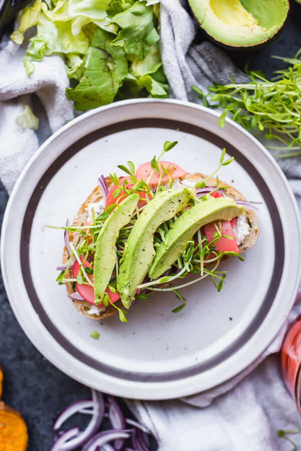 Okay, not gonna lie. Definitely a complicated sandwich recipe. But SO so delicious. I can’t handle these flavors together – between the “cheesy” cashew ricotta, the pickled radishes, the roasted sweet potato, and the crispy microgreens, everything together just…works.